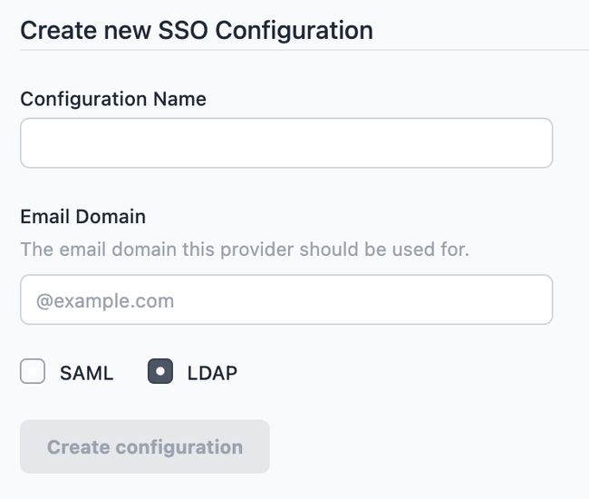 Give the configuration a name to help identify it, and provide the email domain name this configuration should apply to. Ensure the LDAP option is selected - this cannot be changed after the configuration is created.