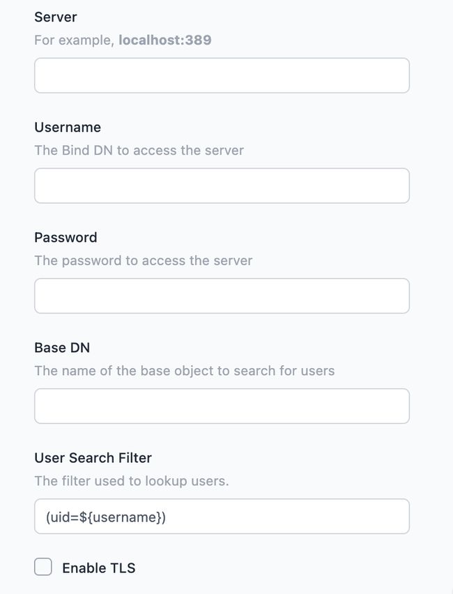 Server- the address of the LDAP server, including port number.Username- the bind DN to use to connect to the server. The user must have permission to lookup users in the directory.Password- the password to connect to the server with.Base DN- the base object under which user searches are performed.User Search Filter- the filter used to search for a user. See below for more details.Enable TLS- whether to use TLS for the LDAP connectionVerify Server Certificate- when TLS is enabled, whether to perform strict certification validation.