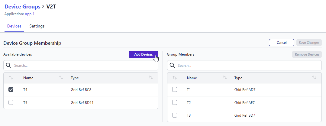 - On the left, you will be shown available devices (ones that are assigned to your application and are available to be added to a device group)