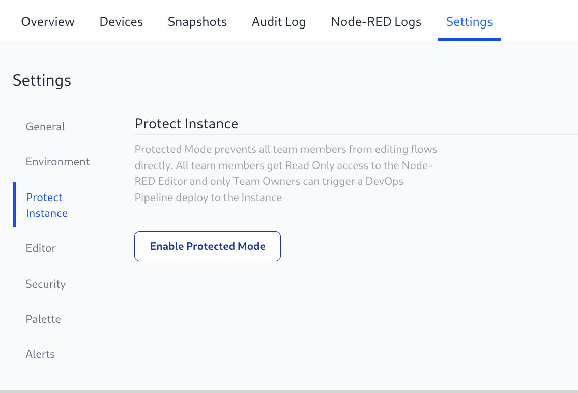 It is now possible to mark an instance as Protected. This means that all team members (including Owners) only have Read Only access to the Node-RED Editor and updates to the flows can only be made by a Team Owner running a DevOps pipeline that targets the instance.
