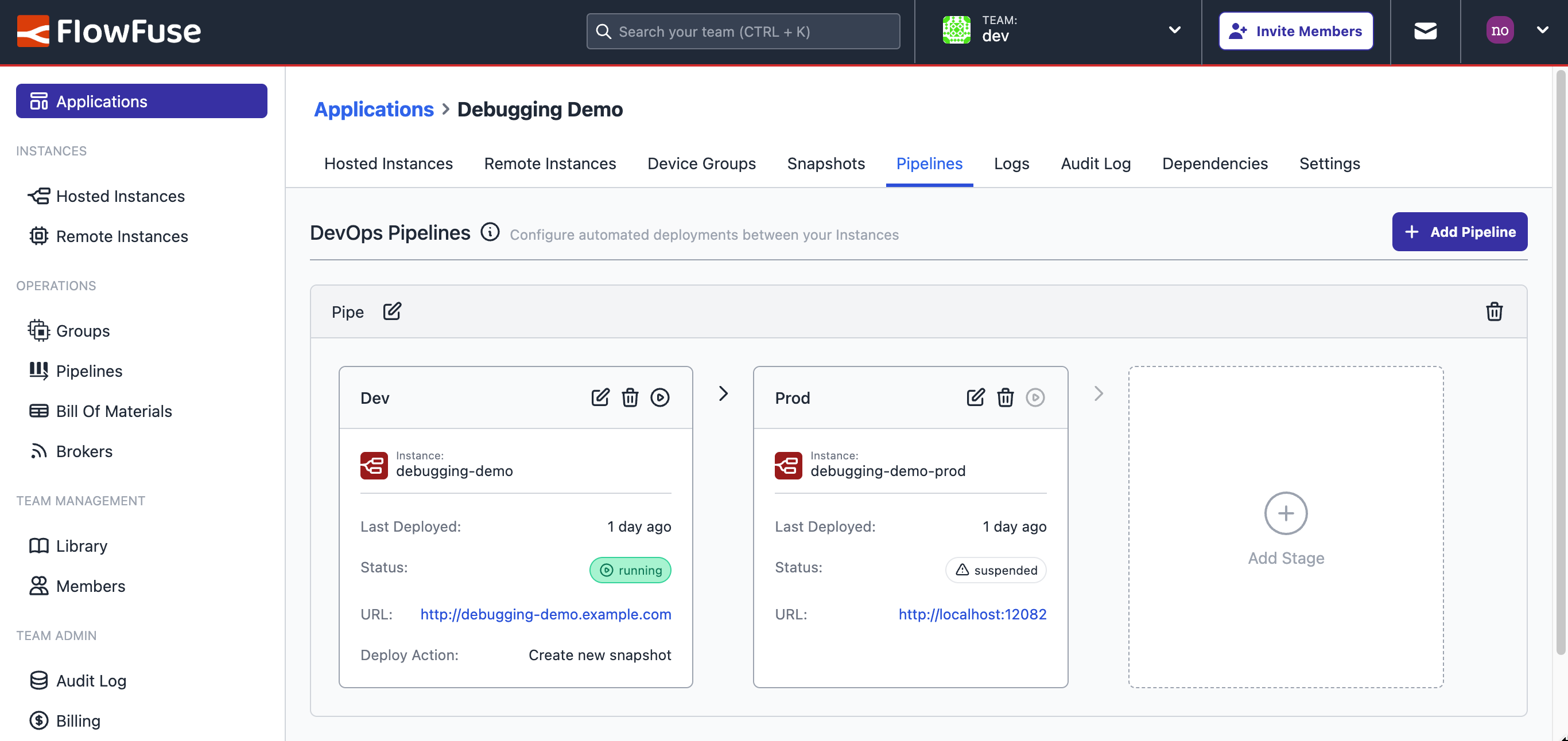 In FlowFuse it is possible to configure a DevOps pipeline for your Node-RED instances. DevOps Pipelines allow you to easily deploy from one instance to another, most commonly used for having an unstable/experimental "Development" instance, and a more stable "Production" instance.
