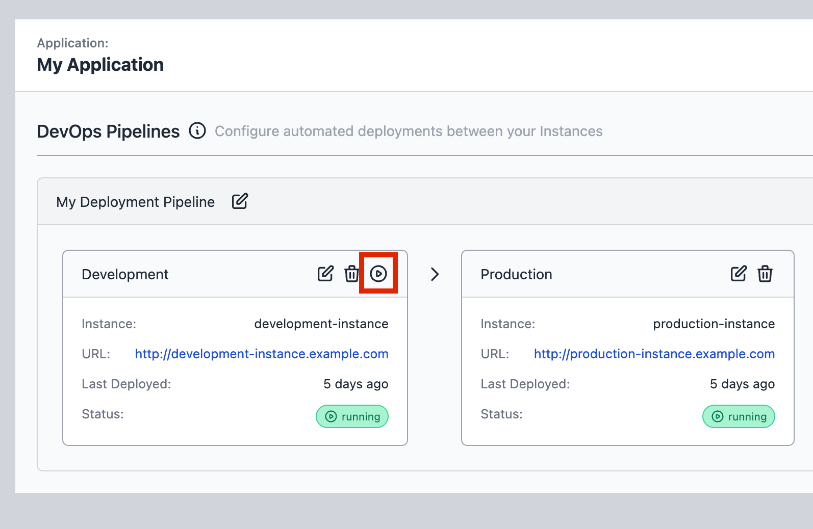 Each stage currently is deployed manually. To do so, click the "play" icon on the source stage. In the example above, it will push from the "Development" stage to the "Production" stage.