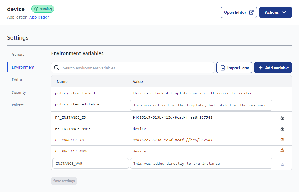 Standard environment variables are set for all Node-RED instances running within the platform: